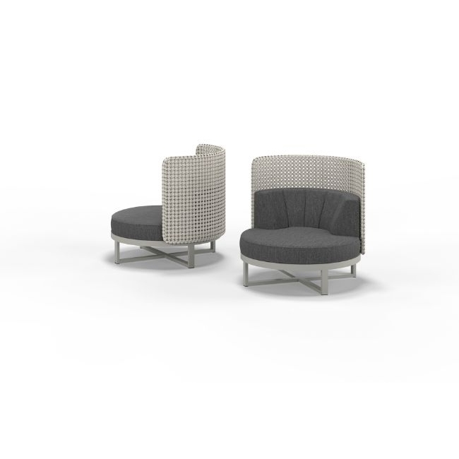 The Munia Mo Hug is an oversized round seating option, woven with vibrant multi-coloured fibres for a playful yet refined aesthetic. The backrest is available in two heights, regular or high – providing added privacy and shade options.