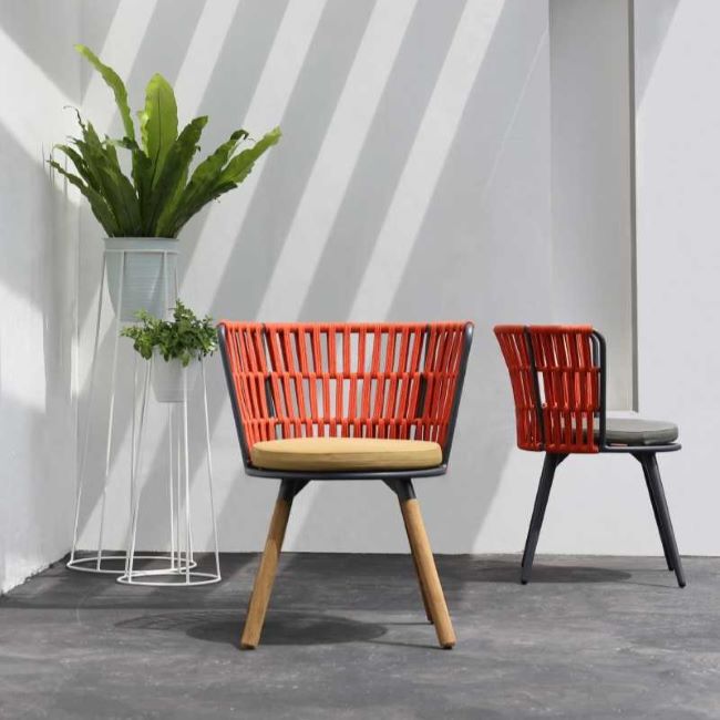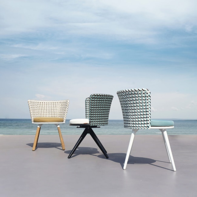We have a great range of outdoor dining chairs and, including the MAMAGREEN Allux range, which are highly customisable and versatile. For example, the simple and stylish Allux dining chair comes with or without arms, and you can specify the powder coating colour from their range and the mesh Batyline colour, at no extra cost. Prefer something with a circular shape and woven design? Then there’s the Ohana chair. The Ohana’s frame is woven by hand with an Olefin rope wrapping around a sturdy powder-coated frame. You can choose the colour for not only the frame and shell, but also the semi-soft cushion. There are literally hundreds of outdoor dining chair combinations for you to choose from to ensure you get the perfect outdoor dining chair to meet your needs.